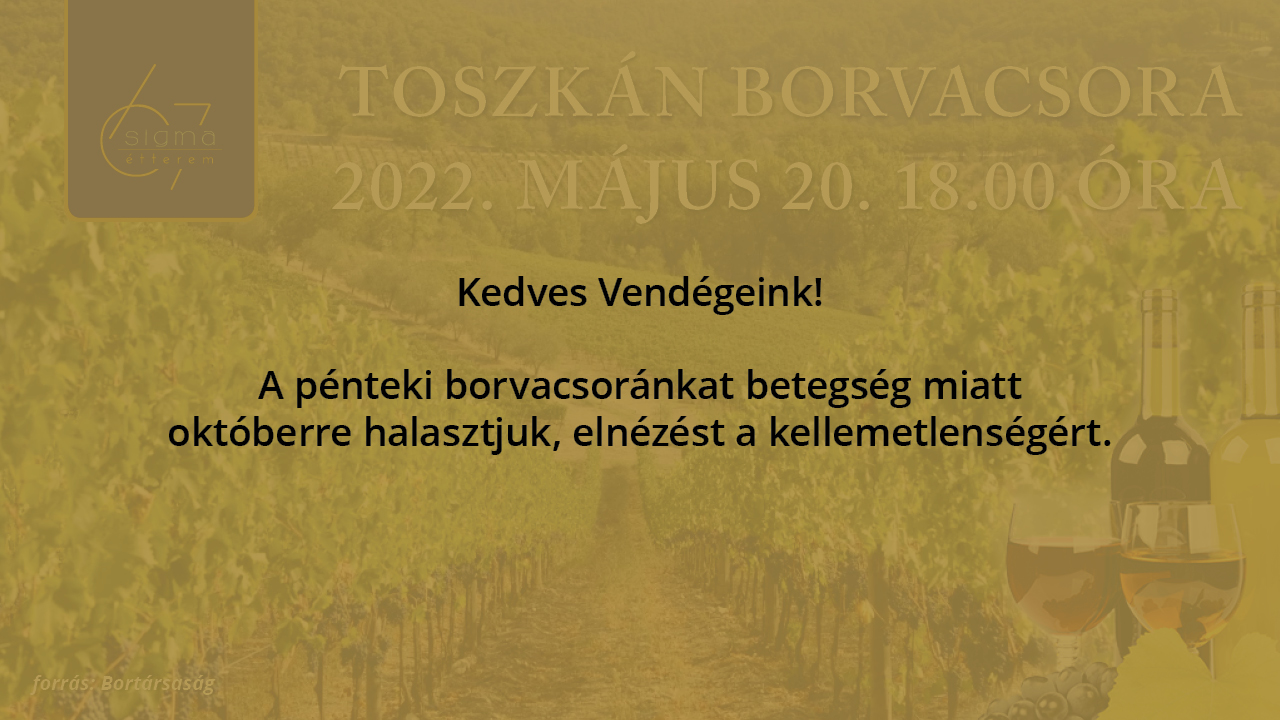 A pénteki borvacsoránkat betegség miatt októberre halasztjuk, elnézést a kellemetlenségért.